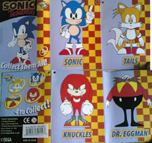 These aren't very big, only 5-6 inches high each. The eyes are embroidered on, and the fabric is smooth (not fuzzy) You can see some felt details like Tails' hair, and glove cuffs. However...look at Shadow! He's missing the white spot on his chest. Are they all like that? Out of all the dolls, this one seems to be the worst likeness, with his uneven and small eyes, bent up ears and missing detail. However, they DID detail his shoes very nicely, and used decent material on all of them. Especially for a 'prize item' such as this, a good effort has been made. Produced by GOSH. Photos by: | ||||||||||||||||||||||||||||||||||||||