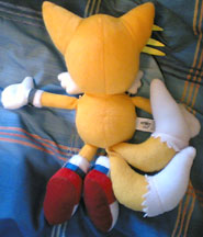 The centered smily mouth and little nose are a great touch. In all, this is one of THE best Tails plushes produced outside of Japan. The tags are very classic, and say "Collect Them All" meaning that they'll release Knuckles at some point. Do you want these plushes for yourself? Good news in 2008 Winter, you can have them! The store GAME in the UK (Likely: England) is selling these, so if you're not there, it's time to contact a pen-pal. The standing photo of their Sonic makes him not look quite so fat. However, it appears his nose is somewhat fuzzy. Standing photo by Rathe. |
