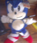 This is an old Sonic plush, likely from 1991 or 1992. He was available in the UK area, but may be based upon a Japan pattern (see the big pointing finger, it was popular with older JP plushes) This plush is not very large, but with really short arms and legs, plus the fact that it's rather furry, makes it quite compact-looking. The mouth, which should be turned up...is not, and is just a long, streight line making the plush seem mildly dissatisfied with something if not rather bored looking. Though the tag is difficult to see, it's also hard to get one with it still attached due to age. Which company could have made this doll? Photo discovered by Berzerker | ||||||||||||||||||||||||||||