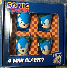 Here is a set of pint size glasses. They're a fun blue color, with a different expression of classic Sonic on each one. 3 you'll recognize, classic forward hands on hips, winking forward, 'steamin' Sonic' (without the steam) but the 4th is a classic re-do of 'surprised Sonic' so it's actually modern, but set in the classic style. These also come as smaller shot size glasses. This set is 19.99 if you can find it in Spencers Gifts in 2011/winter. Discovered by SonicBoy19 | |||||||||||||||||||||||||||