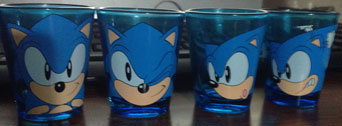 Yet more shot glasses from Spencer's Gifts. These little glasses are collectible, whether you use them for anything or not. At left is a "sprite" set, where they took Sonic 2 sprites, pixels and all, & added them to tinted-base glasses. You get impatient Sonic, running Sonic, Flying Tails & standing Tails. The colored bases bring a little contrast & some | ![]() |