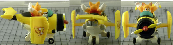 The tiny Tails figure is nicely detailed, and posed convincingly inside the vehicle. The 2-tail symbol looks great on the 'wing' ends, and it does appear on both sides. You can't see it in the photo but the front (around the propeller) is also textured with detail. Photographed & owned by Taaron. | |||||||||||||||||||||||||||||||||