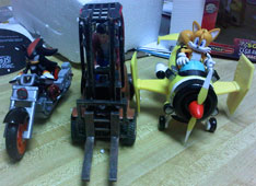 Notice something DIFFERENT about these figures with vehicles racers? Knuckles (right) demonstrates how you can tell new racers from old ones. When this line was re-stocked, Jazwares used sturdier plastic for the figures. (that improved plastic) and they also packaged the figures standing beside, rather than in/on the vehicles. This is likely to reduce breaking in shipping. | ![]() |