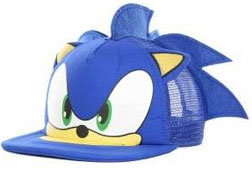 Here is a 'trucker cap hat', which just means the top is taller than usual & the back is a plastic screen/mesh material. This is yet anooooother variation on the "Big Face Cap" which is basically all over the place here. This time it's modern Sonic on the bill & top....but they've added little flappy 3D ears & 3 rows of sewn felt mini spikes to decorate the back of the hat. This hat is sort of mid-way between a regular hat & one of those 'costume' type character hats. | |||||||||||||||||