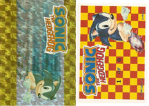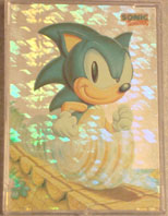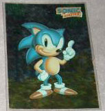 Card 6 isn't nearly as impressive. This is the seen-it-a-billion-times standing 1 finger Sonic. It's nicely shaded and everything, but it doesn't really put the foil to use or act creative in any way. It does, however, illustrate that where they put the heavy ink, no foil comes through at all. Both above photos by Scott Simms. | ||||||||||||||||||||||||||||||