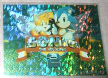 Sonic that the #3 above has, only this time, there's no background. Still, the 'after image' looks neat when seen through the foil cardstock. The #2 has the familiar Sonic 2 logo with wierd Eggman/Robotnick hybrid grabbin' background. The foil effect here enhances the "2" as well as the ground. It appears that all the backs of these are the same, and numbered. Both these cards photographed and owned by Scott Simms | ||||||||||||||||||||||||||||||