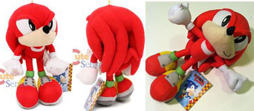 Here are 'in hand' (not factory photo) shots of GE Entertainment's new "Classic Style" Knuckles small plush. It has a few issues but it is still better than anything Jazwares made at a similar size. Notice the right-side photo...where are all of his shoe-bolts? Were they stickers or decals, that have gone missing? The first 2 photos illustrate decent spikes, big 3D fists & an ok expression. His body may be a tad small, or the legs slightly short, but on a doll of this size, it's not too terrible...if all the details actually make it onto your plush! Photos discovered by ML1024 | ||||||||||||||||||||||||