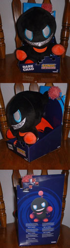 Now HERE's something to see! Tomy DID tackle a doll no one else (in the USA) did, which is to create a neutral-dark Chao. (No character or animal feature) There is an old Japanese one, but it is extremely costly and very rare...so it's good to see someone taking on a Dark Chao elsewhere, and perhaps more affordably....if.... This thing was easier to find. Along with the rest of Tomy's 12 Inch line, this was very rarely reported at brick/mortar retail which was supposed to be Target. The stock photo is ok, but it doesn't show the head top or the ball. The ball is a tufty red pom-pom. What about the tail? Naturally, they choose the 'sharky smile' one (they hatch that way) with the 'meanie eyes' that it can get when being a dark. Are the eyes a bit big/low? Either way, the features are embroidered & quality. |