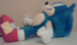 GE Entertainment is set to release this "Mini Sonic" plush some time in the fall of 2011. But just how 'mini' is it? What size can we expect to see? No matter the size though, this doll looks good so far. Distinct cuff & sock details, good shoe-shape and a decent enough looking expression. The fingers appear to be strings or lines on the fabric, but that may be expected at a smaller size like this. Photo discovered by SonicCookie | ![]() |
