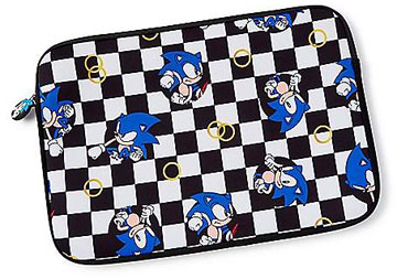 Not an electronic, but an electronic accessory, it's a laptop sleeve with a fun classic theme. It's black and white checkers, with a scattering of classic Sonic arts and rings. It has a zipper top and the zipper pull is a circle /rubber item with a Sonic on there too. It is nicely Sonic, especially because of the zipper pull. This is a Spencer's Gifts item in 2021, and it should be about 20 dollars. |