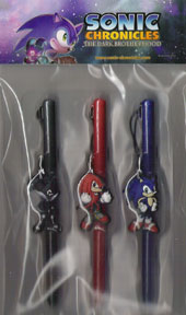 This is a 2 pack of Magic Stylus... styluses for the DS. As you can see, they both snap open and extend to become normal sized. The loop on the cap lets you hang them...but if the cap isn't secure the pen part may just come off. The blue one has Sonic, and the black features Shadow. They're a nice gizmo item to help Sonic up your DS! Photo discovered by SonicFan2525 | ![]() |