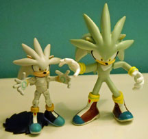These are "Morphlites" which are small, nearly-static-pose figures that have a lighting up feature for some reason. "Morph" means "change" so...what changes with these guys? Nothing. They're smaller than the 'megalite' seen above, but still made by LiteForce/Tech4Kids. The lighting effects here make sense, Shadow has an emerald that glows for Chaos Control like effect, while Silver's glove glows to represent his psychic power. Their eyes also light up. There is a hole in the top of the plastic bubble on the card so you can press down & test out the lighting feature. Their non-lighting arm has 2 positions (up or down) so they're not completely fixed-pose. The bottoms of the feet aren't detailed either. (see photos below, you can't tell in the package) They're 6.99 as shown, at Toys R US in fall season 2012. Photos by Taaron. | ![]() |
