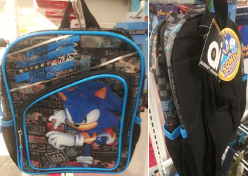 Here, Accessory Innovations makes a mini backpack. This is a 2021 item, but how big is it? If standard ones are about 16 inches, then this must be smaller than that. Notice that it does not have the usual exterior pocket area because it is 'mini'. The theme here is Sonic, Tails & Knuckles, all in CG. They're on a blue/yellow/black stripe background and all in poses that have a 'moving forward' type look. There's also that jagged-look gold ring behind Sonic. His name appears in a red italic font somewhat like the logo font at the bottom. The bag border is black & the zipper pull is red. It appears to have that 'super shiny glaze plastic' on the Sonic portion of the bag, or maybe just his face? Accessory Innovations items are usually priced pretty well, so this should be less money than their standard size bag.Where is this sold, and what is the real size of the mini bag? |