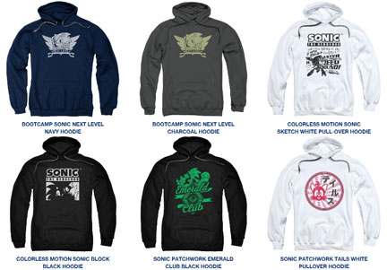 Here are 6 Sonic hoodie sweat shirts straight from the Sega Shop online. They are basically just 3 designs, and the other is a color variant of the first. The first is "Sonic Rings & Wings" which is classic Sonic in the winged ring balancing a ring on his finger under the logo. These shirts are either a middle-blue or black, with draw string hood. |