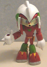 Missile Wrist is a rather odd addition to the line. This robot was one of the first robots that Eggman sent after our heroes in the Sonic X tv show. It was rather un-charismatic, and non-important in the grand scheme of things, however...here it is. This figure makes it look almost whimsical and fun. (although it was really a destructive badguy) It's quite pose-able, and will even sit down, adding to its odd charm. It is obviously different than all the other figures. It's not as big as it was in the show (if it was, it'd be the size of the mega bot!) but it is still fairly large. The 'dome light/eye' is what lights up for it. You can extend both parts of the arms, and rotate the bottom of the arm 360 degrees to simulate missile firing, which is a nice touch. It has huge feet, so it's pretty stable too. The arms twist at the shoulders, and the legs at the hips. The 'knees' will also go 360. It is all hard plastic, with some paint details. This one has a really bright light! You can use him for a flashlight. Coulda: |