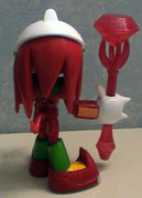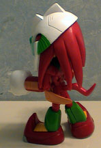 Mega Bot Tails is actually kind of cool. You can imagine Tails inventing something like this suit, if he had to. (but who knows why) The suit makes him look proportionate, and not suffer from 'big body' at all. This is one of the most poseable figures on the line, with his tails for support. You can see that they also bothered to color the insides of his ears this time, however they added a bit much 'white space' to his tail tips (they are actually about half+ white) which is inaccurate, but somewhat nit-picky. Tails' magic space wand or whatever is more of a staff. It is a good deal longer than Sonics'. There is a bump on the emerald top for some reason. If you look closely, the bottom is divided into 2 tail shapes, with zig-zag ridges to denote tip color although the staff is all one color. WHY do they think it is necisary for the accessory to have body-part features of it's carrier? |