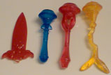 Aside from wearing the wierd space gear, these figures have semi-translucent plastic rods. The rods are slightly soft, and snap into 2 pieces. The pieces then fit into the top and bottom of the figures' hand, and transfer the light from the LED in the fist, when you press a button on the figure. The helmets do not come off, nor do any suit-pieces. These are more well-constructed than the Mega Bot figures. | |||||||||||||||||||||||||||||||||
