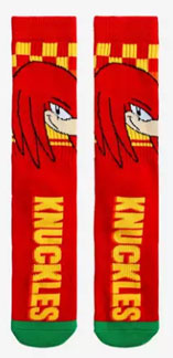 These are the Knuckles Checker Crew Socks from Hot Topic. It looks like some kind of neoclassic Knuckles portrait at the top with him looking somewhat...sly? over a checkered yellow background. The feet-tops have his name spelled out, and the toes are green. (The heel should be too) This is certainly on purpose to resemble his shoes colors. They're certainly bright/a stand out pair. This is adults sizes, for about 5 dollars in fall 2024 | |||||||||||||||||||||