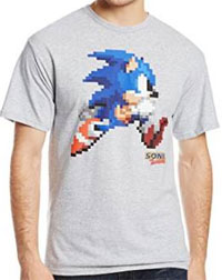 This is a mens' sizes shirt, called "Pixel Punk", but there's nothing really punk about it. It just has large pixelated Sonic 1 sprite running Sonic on the front of a mottled gray tee. The classic logo is small, under one of his feet. The pixelated art really broadcasts 'classic game' which is nice. This is in the Sonic Gear Store in 2014. | ![]() |