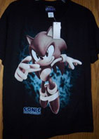 More retro-style to appeal to classic gamers. This time, everything's a brown/orange theme. The shirt itself is dark brown, and Sonic has been changed to various shades of brown. His shoes ended up yellow/orange-brown, the tan parts stayed the same, but there isn't a speck of blue on him. Interestingly enough, this brown overload doesn't really make for a terrible design. The words "Super Sonic Since 1991" are once again not true (there is no shirt with actual super Sonic on it) but are written in a more 1970s font style. This is available at Sears in the USA in the summer of 2008. |