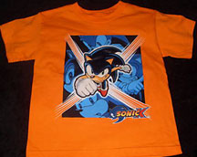Here comes mysterious 'rocket shoe' Sonic. Since when did he need rocket shoes? You may remember this art from the 15th anniversary shirt on the other page. This time, it's on a darker orange, with a ring of stylized fire in the background and the Sonic X logo. This shirt only comes in small sizes. | |||||||||||||||||||||||||||