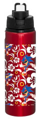 The Sega Shop Online adds "Hawiian" to their list of patterns, and starts it off with this metal water bottle. The pattern appears on other items too, in summer 2022. It has hibiscus flowers, rings, swirls and the 'thumbs up' modern Sonic stock art modified to be wearing sunglasses. This pattern repeats all over whatever item gets the Hawaiian treatment. In this case, it's a red metal water bottle with black plastic cap. It is 30 dollars |