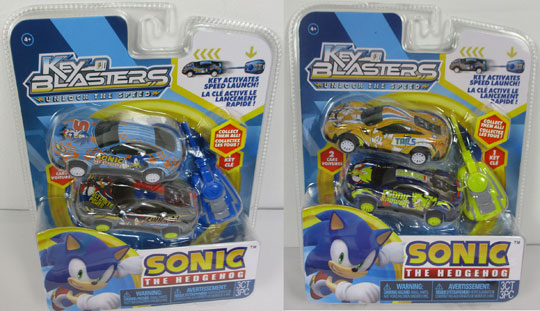 Forever Clever has a line of cars, The Key Blasters. These toy cars use a key to launch across the floor or table. They cooperate with brands to make licensed character theme cars, and that now includes Sonic. Each pack has 2 different cars and 1 key with which to launch them. "Unlock the Speed!" The little hexagon says 'collect them all' then the package proceedes to not tell you what else there might be to collect. This clamshell style package has a blue Sonic themed car, with pictures of him on the hood and the side and some checkers. The bottom gray car has Shadow with his logo, "ultimate power!" and 2 pictures of him as well. |