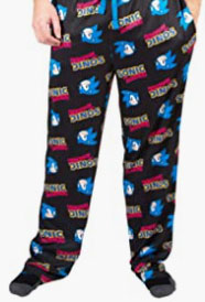 Here are some fleecy pants which don't seem to have a title. They're adults sizes, and so will fit anyone. It's more of that smooth 'fleecy' (not actual fleece) material, with elastic waist, no-cuff ankles and blue draw string tie. They're black, and have an all-over pattern of the same classic Sonic face and the classic logo all over. It's large enough to mostly not be busy. They're about 25 dollars at Amazon, if you didn't have anything similar already. |